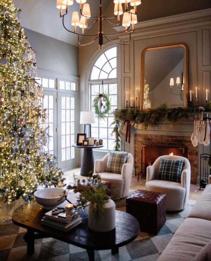 This space has soaring windows, a huge tree, and that old brick fireplace. It’s proof that rustic christmas decor can be upscale without going cold. The mantel is dressed with cedar, the stockings are neutral, and the plaid pillows echo the tree ribbon. Firelight plus fairy lights equals magic. I swear even my to-do list feels shorter when a room looks like this.
