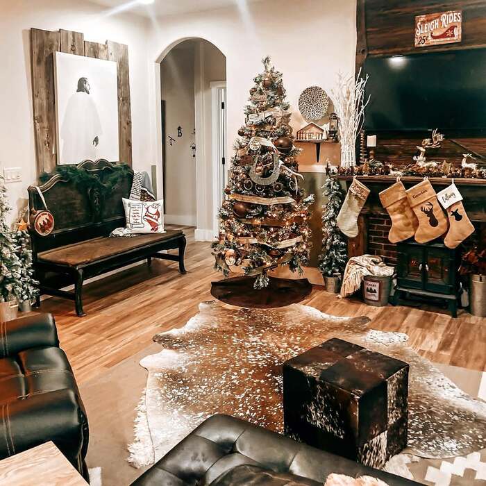 This living room might be my favorite because it’s fearless. There’s a cowhide rug, a bench made from what looks like a church pew, and stockings in tan and green. The tree carries warm copper and brown ornaments with ribbon that feels like lasso rope. This is rustic christmas decor that knows who it is.