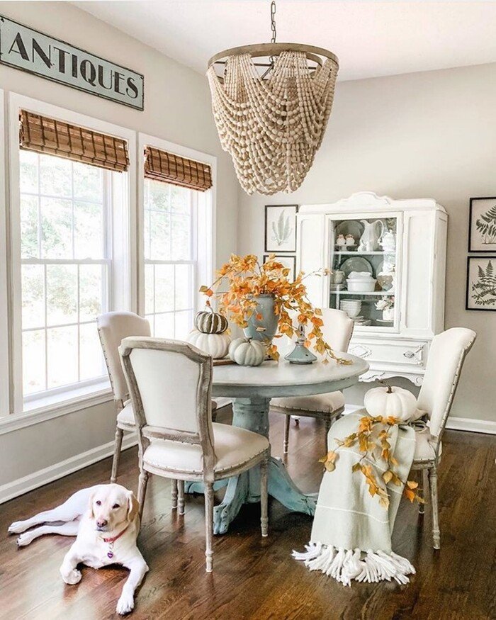 The fall touches are subtle but cozy: pumpkins, warm leaves, a soft throw. It’s rustic farmhouse dining room decor that leans seasonal without screaming “I BOUGHT EVERYTHING IN ONE DAY.” Plus, the distressed white chairs and pale tones keep it light.