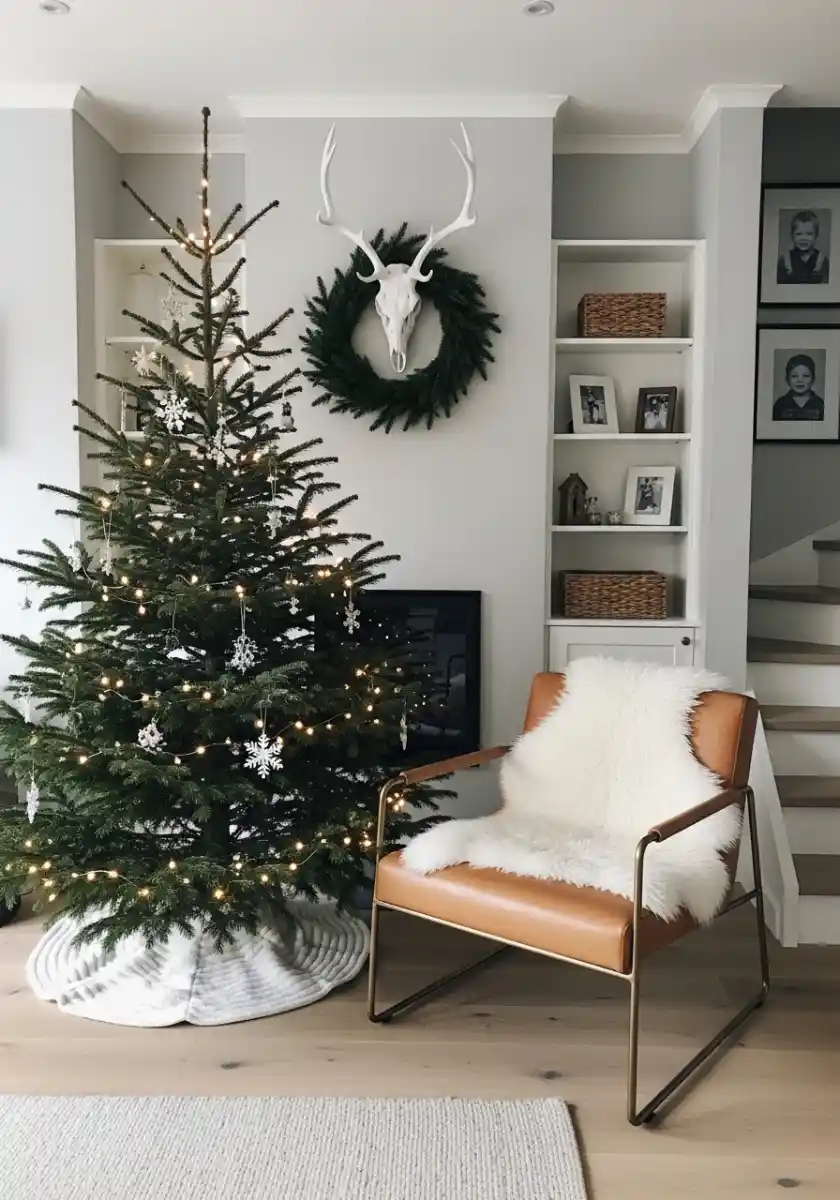 A real tree glows with warm fairy lights and white snowflake ornaments. Right above, a deep green wreath frames a white stag mount, which sounds bold but somehow reads rustic and friendly. Blonde wood floors and soft gray walls keep the scene airy. I’d sit in that caramel leather chair for hours, especially with the fluffy sheepskin layered over it.
