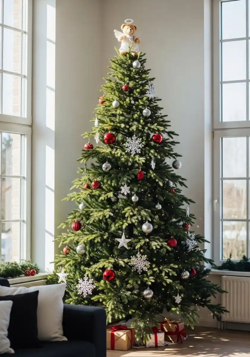 This tall spruce is classic Nordic beauty. Tiny warm lights, red and silver baubles, and delicate metal snowflakes sparkle in the sun. The teddy angel topper gives a wink of nostalgia. Simple wrapped gifts sit on the bare floor. Just a touch of greenery on the window ledge keeps everything bright and clean.
