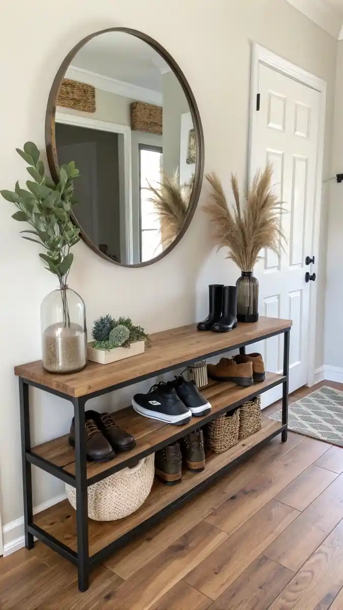 This design uses a slim metal and wood console under a big round mirror. It’s light, it’s open, and it doubles as a tiny display table for stems and candles. As a shoe rack in living room entryway, the two shelves handle seven or eight pairs without feeling crowded. The top can stay pretty, so guests see style before sneakers. I tried something similar and felt more adult than I actually am.