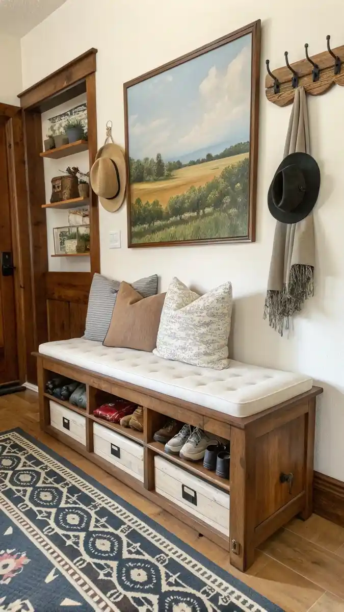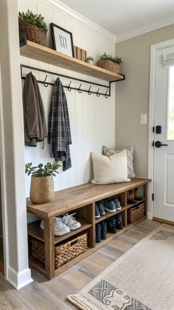 This is the calm entry for people who want the living room to flow right into the door area. Pale wood, pale rug, and simple pillows. The bench has one low shelf and a middle plank that splits the space into two layers. It acts like a shoe display, but not in a loud way.