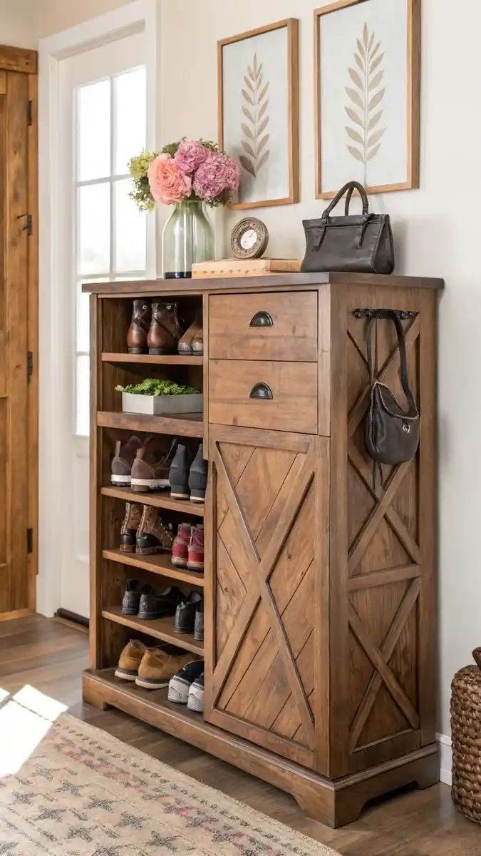 As a shoe rack in living room entryway, the magic here is height. Vertical storage lets you use a smaller footprint while still handling many pairs. If you have an outlet nearby, add a little charging basket inside the cabinet so devices charge out of sight. That way the top stays pretty with flowers or a clock.