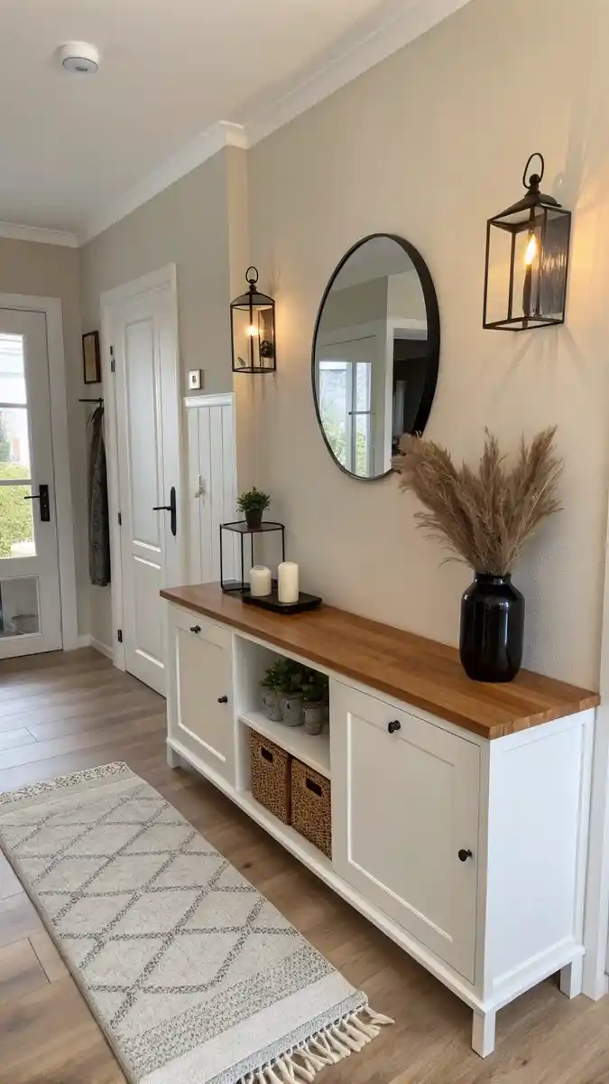 Not every home has room for a built-in. This design proves a free-standing piece can still act like a mudroom. The cabinet’s wood top feels warm, and the big round mirror is a lifesaver. You do a last-look check for cheddar cracker dust on your face before the school run. I’ve done that.