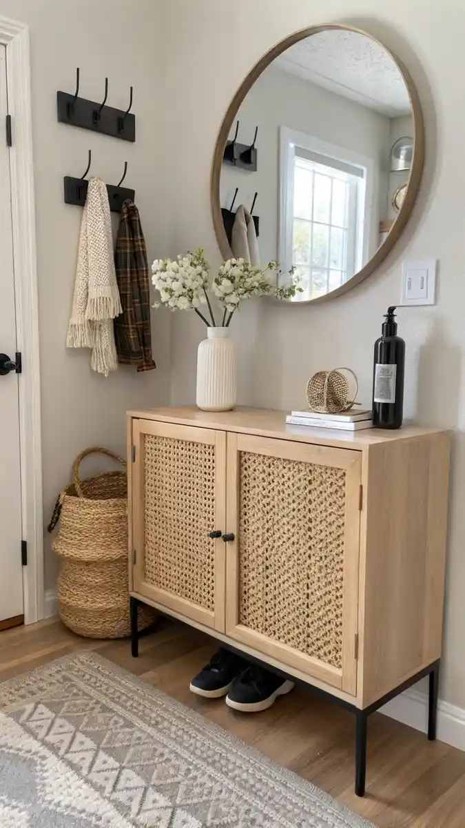 This cabinet with woven cane doors made me smile. It looks airy, and the tall legs keep the piece from feeling heavy. Shoes can tuck under the cabinet or hide inside, giving you two zones of storage. It’s perfect if the entry is small but you still want a furniture moment. Place a round mirror above and you’re basically done.