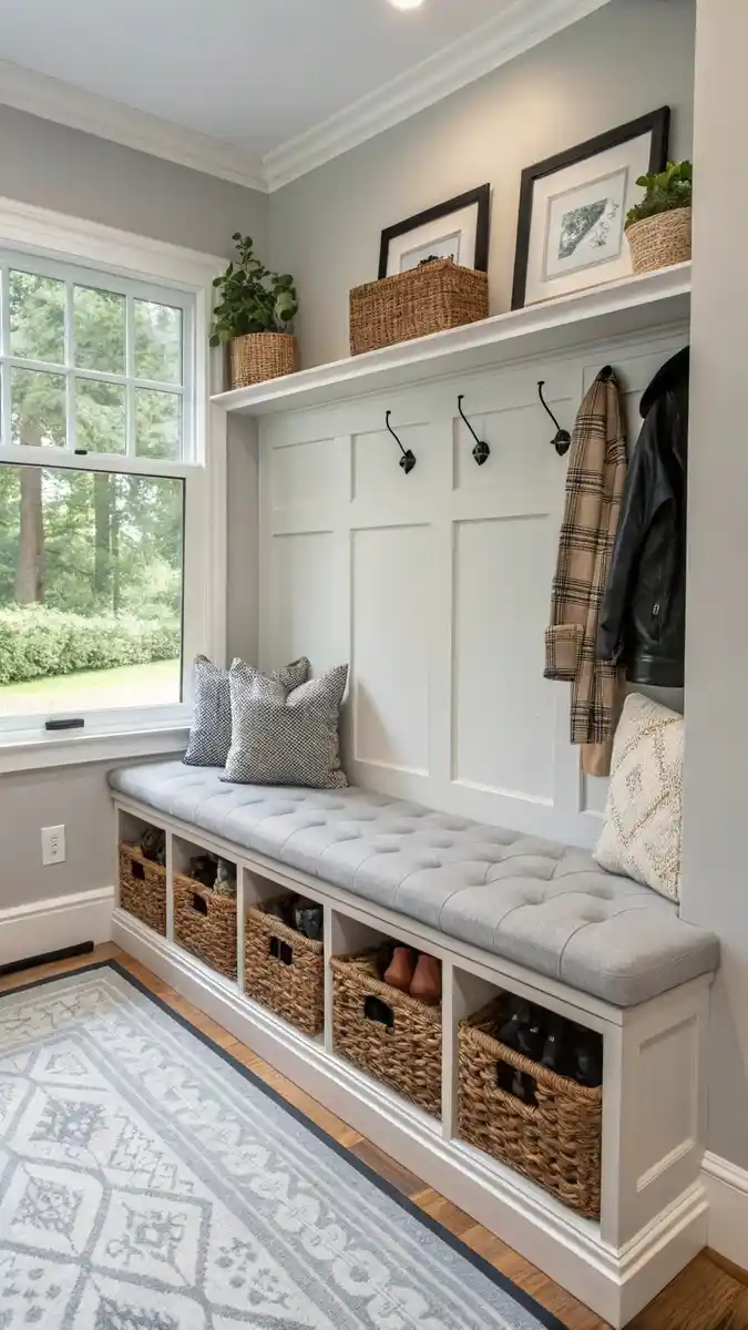 This built-in runs wall to wall under a window and looks custom. A tall back panel with square trim gives texture, and the deep bench cushion makes it feel like a daybed. Underneath, six open bays hold big baskets. It functions as an entryway shoe storage bench while still reading like a cozy window seat.
