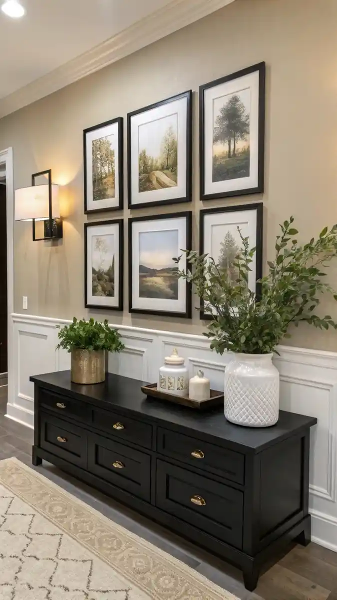 This idea is bold and kind of fancy. A black dresser with brass pulls sits under a grid of framed prints. It grounds the hallway and secretly hides a ton of stuff. Inside the big drawers, use shallow dividers to store flats, flip flops, and slippers side by side. It is a classy entryway shoe cabinet in disguise.