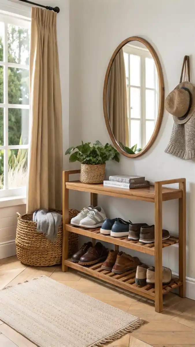 The last idea is honest and sunny. A small teak rack with three slatted shelves sits under a round mirror and near a big window. It’s beachy without seashells. This front door shoe organizer keeps air moving around damp soles and makes cleanup easy. A woven basket beside it takes blankets or outdoor toys.