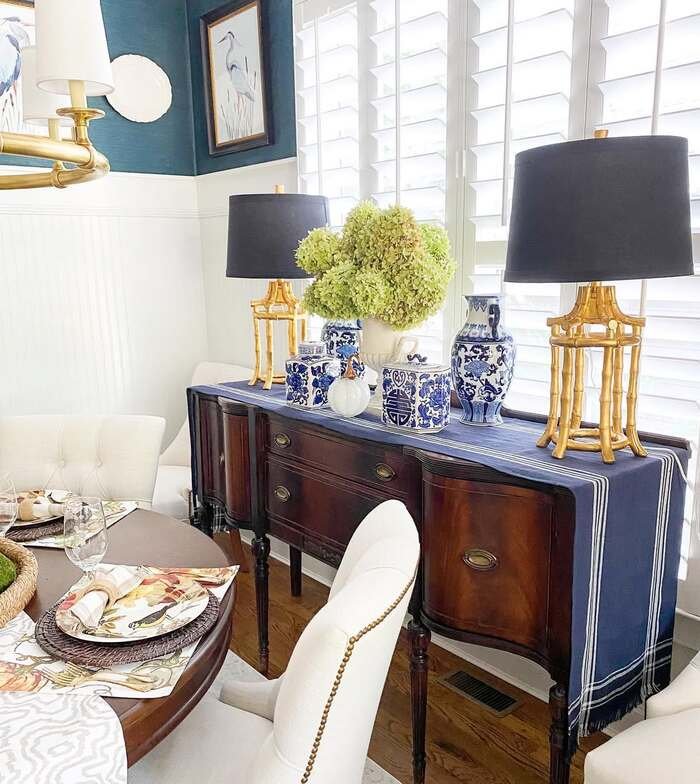 A sideboard like the one in the first photo immediately makes a statement. The combination of deep blue and gold accents elevates the entire room’s look. The blue and white vases on the sideboard, paired with the elegant gold-framed lamps, give this room a timeless elegance.