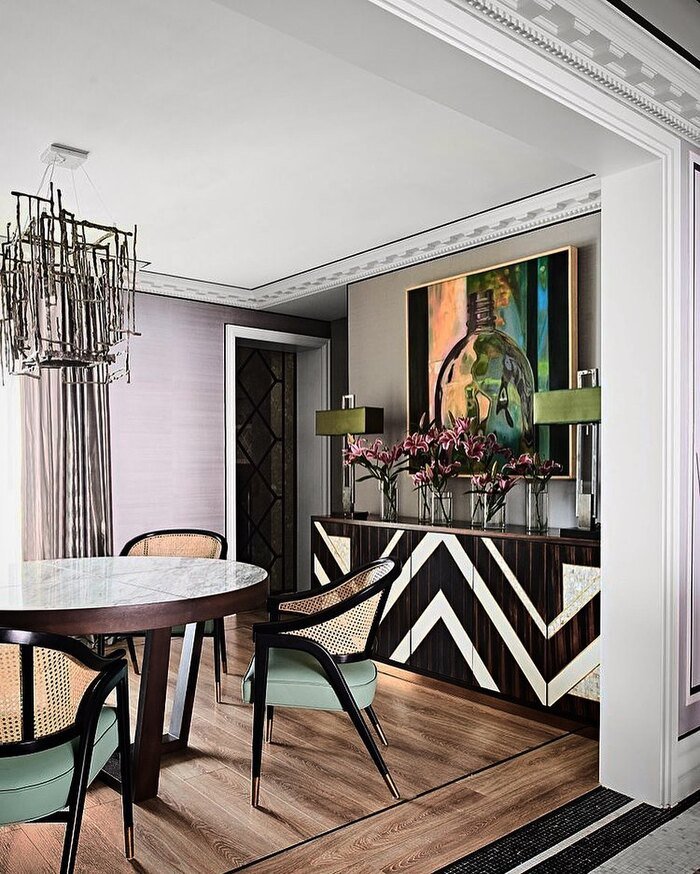 This sideboard decor idea takes inspiration from the glamorous art deco era, using bold patterns and modern aesthetics. The striking chevron design on the sideboard, combined with colorful artwork, makes this space feel both contemporary and sophisticated.