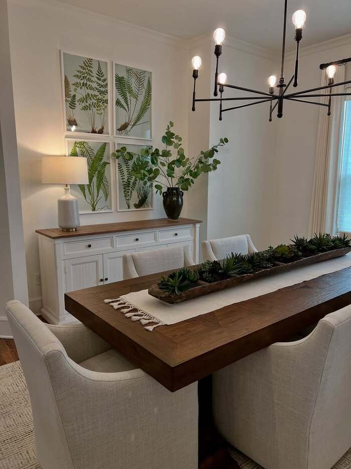 The framed fern prints above the sideboard add an earthy touch that’s both soothing and sophisticated. The overall vibe is minimalist yet warm, making this a perfect style for those who appreciate simplicity and natural beauty.