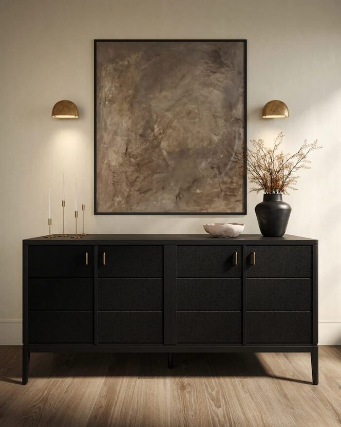 For a more daring approach to sideboard decor, this design uses textured materials to create visual interest. The rattan-like texture on the sideboard creates a rich, tactile experience, while the simple black and gold accents keep the design grounded and sophisticated.
