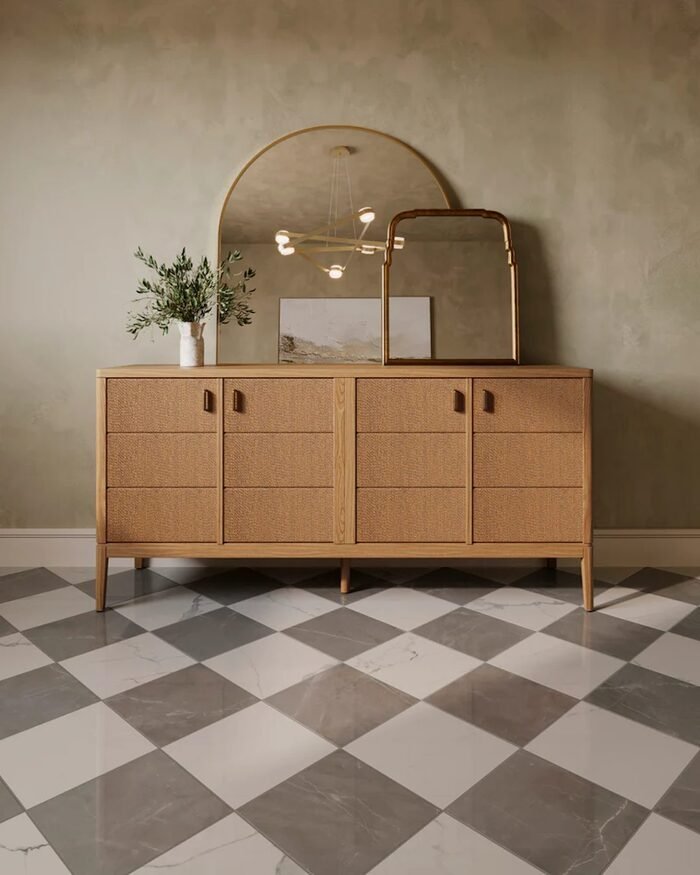 In this stunning sideboard decor, a minimalist approach shines through. The large, reflective mirror above the sideboard amplifies light, making the space feel more open and airy. The simple sideboard itself, with sleek lines and soft finishes, enhances the modern vibe of the room.