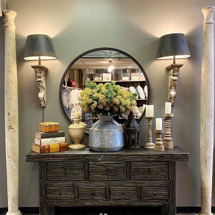 Pro Tip: The mirror’s frame is key in balancing the rustic sideboard. A simple, round frame can keep the vibe modern and clean, while a more ornate one adds personality.