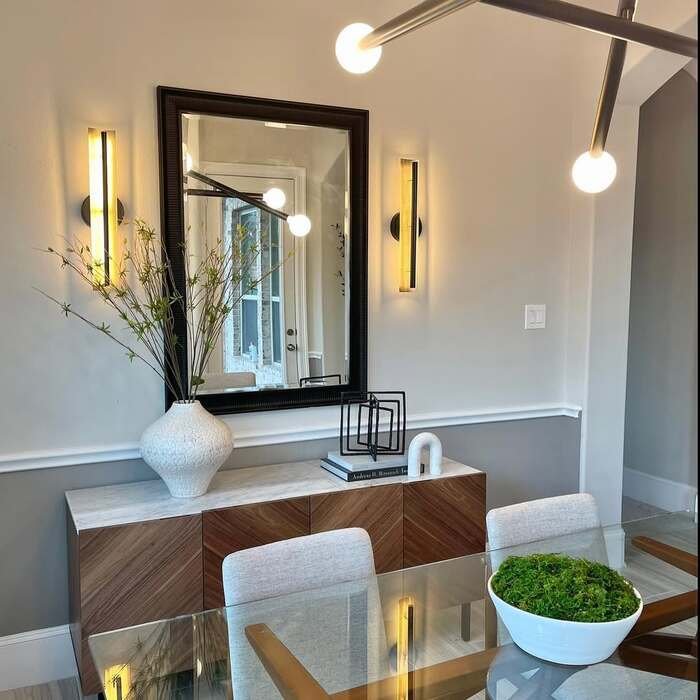 Balance the sideboard’s decor with pendant lights or sconces. Match the lamp style with the decor for a seamless look.