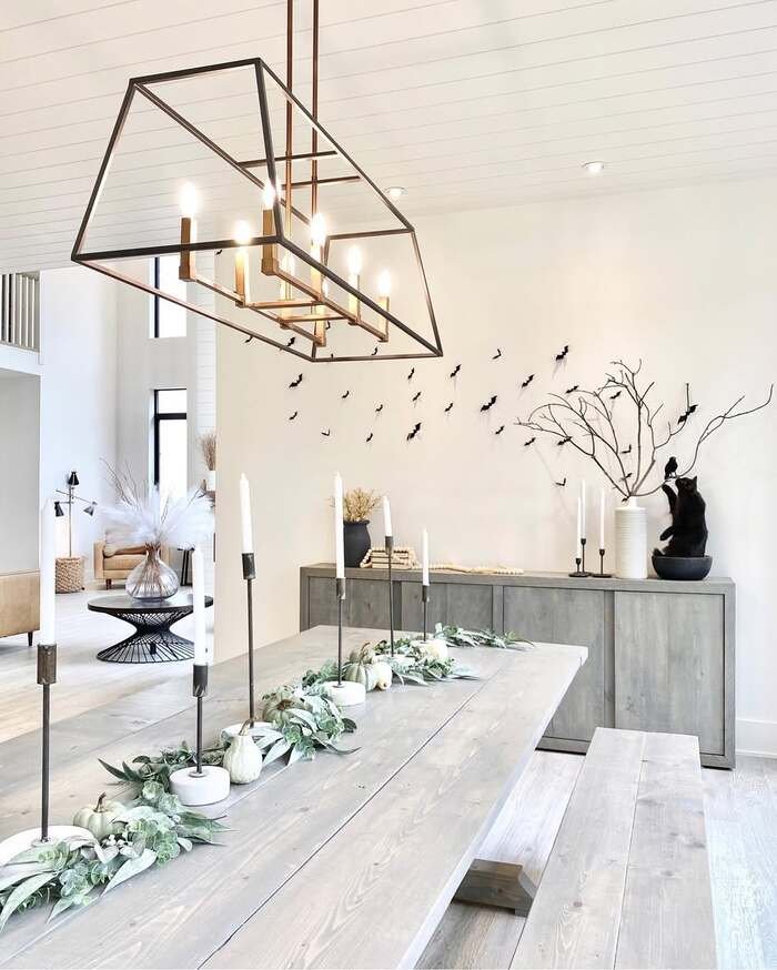 The addition of candles, stacked books, and a leafy green plant makes this space feel lived in and welcoming. The mix of materials – from the wood of the sideboard to the metal lamp fixtures – adds textural contrast without disrupting the flow of the room.