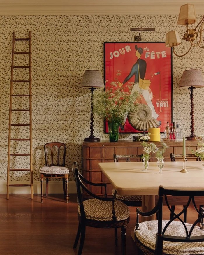 In this design, a stunning, traditional wooden sideboard creates a warm, inviting atmosphere. The brass lamps paired with the mirror add an elegant touch that contrasts nicely with the bold floral wallpaper. I love how the mirror above the sideboard gives the space an open and airy feel while also reflecting the soft light from the lamps.