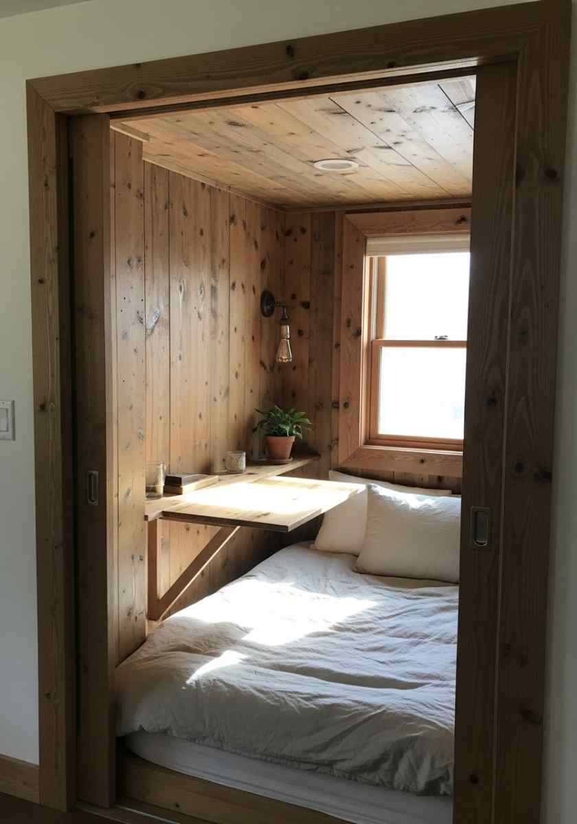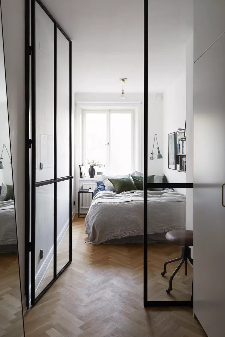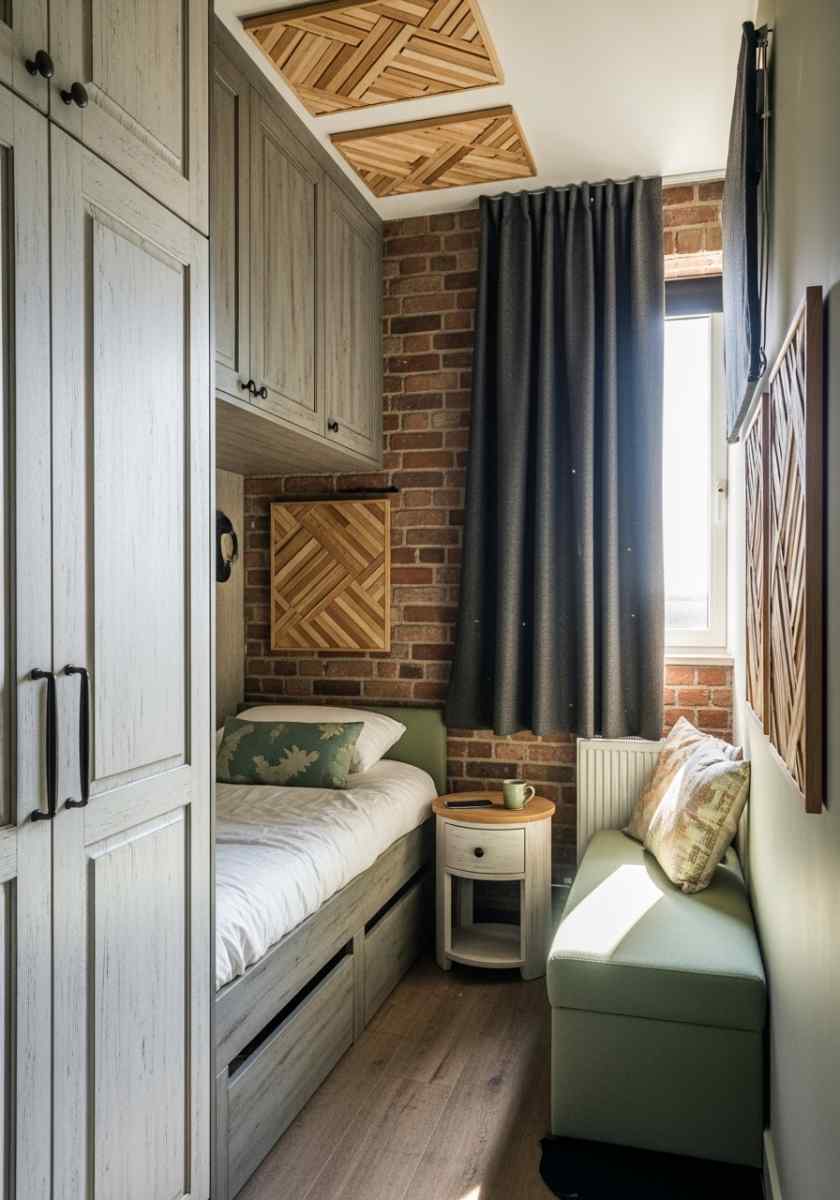 Sometimes you can’t steal space, but you can steal sunshine. Black framed glass panels act like walls while letting light flow from a main room into a tiny sleep zone. This keeps the bedroom private enough but not cave-like. Add pale linens and a few throw pillows in greens or blues to soften the industrial edge. I recommend a track door or pocket door so you don’t eat floor space with a swing.