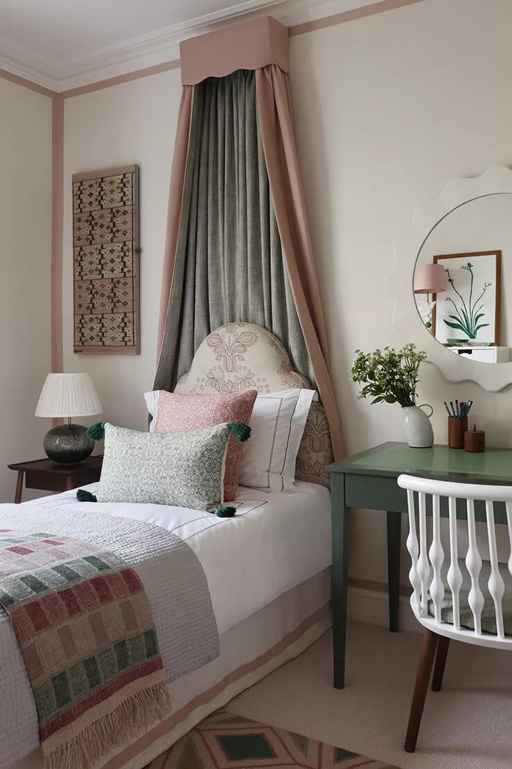 A slim twin tucked near a desk can still feel special. I sew a tailored pelmet at the ceiling line and hang a deep drape behind the headboard in a restful color like clay pink. It frames the bed and hushes the room. Mix embroidered pillows, a green desk, a scalloped mirror, and you get pretty but not prissy. Teens love this, guests love this, and frankly I love it most.