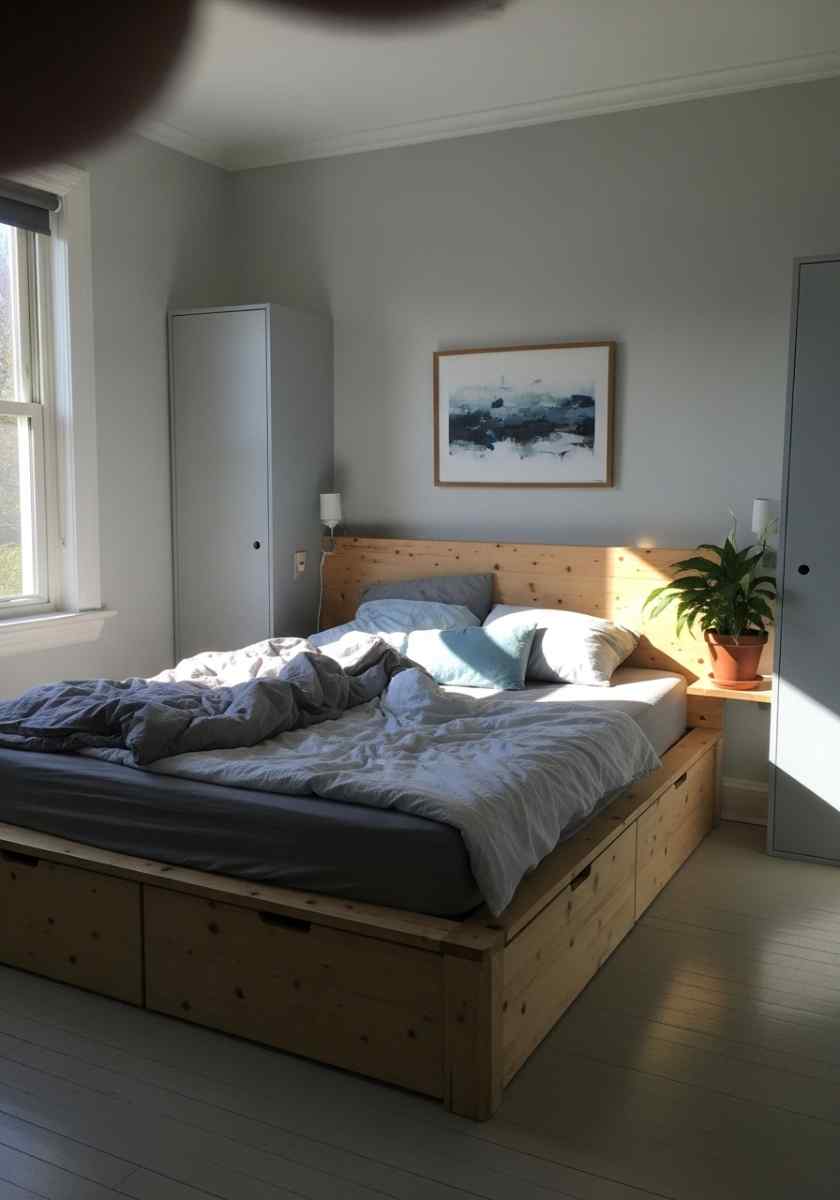 A 90 sq ft room can still feel calm if every piece works double duty. Start with a low platform bed with deep drawers on both sides, so daily clothes and linens live under you. Add a slim wall-to-wall shelf over the headboard for books, phone, and a tiny plant—no nightstands needed.