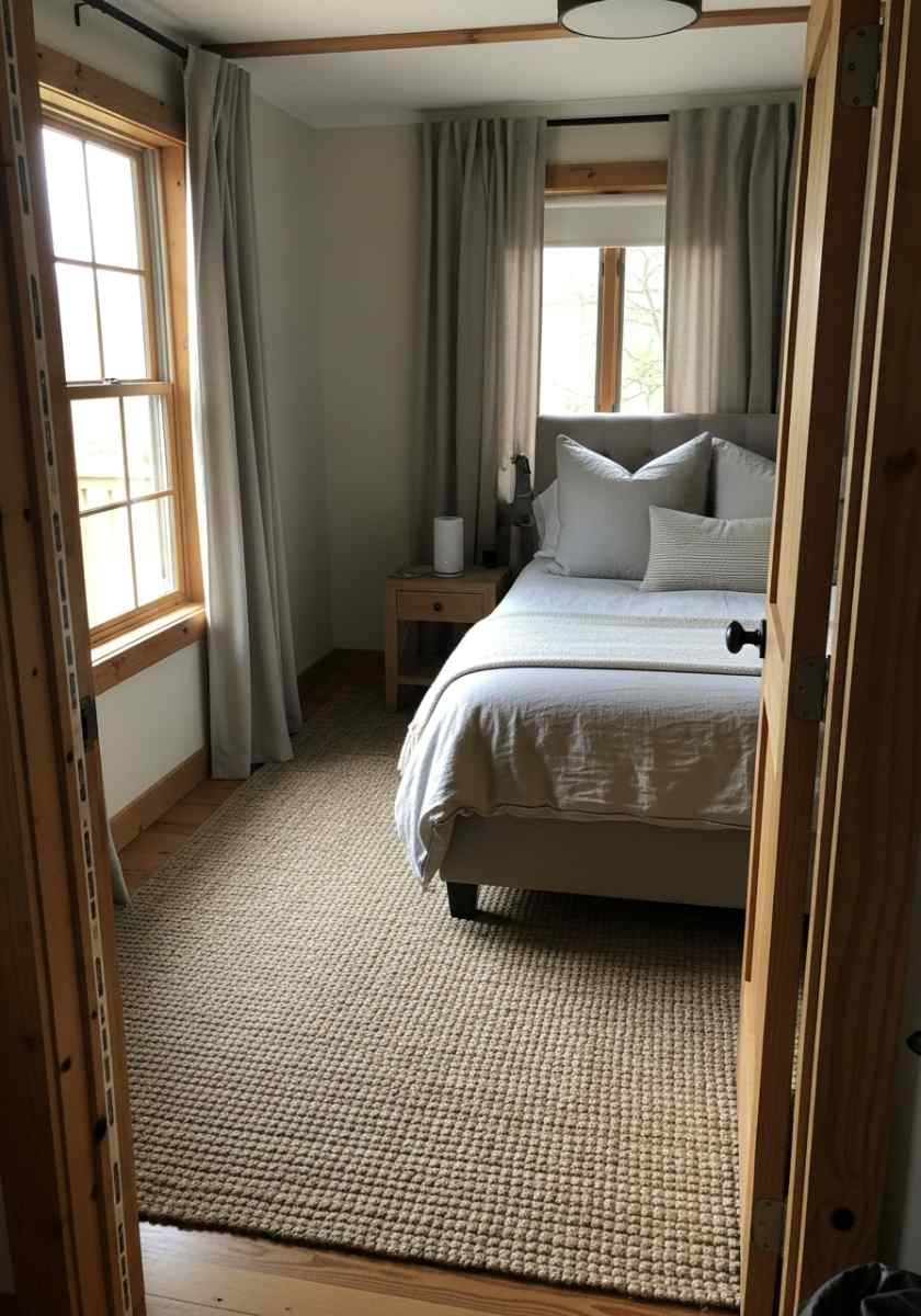 Sound is part of rest. Add a padded headboard and heavy curtains to dampen street noise. Put felt pads under everything and add a draft stopper at the door.
