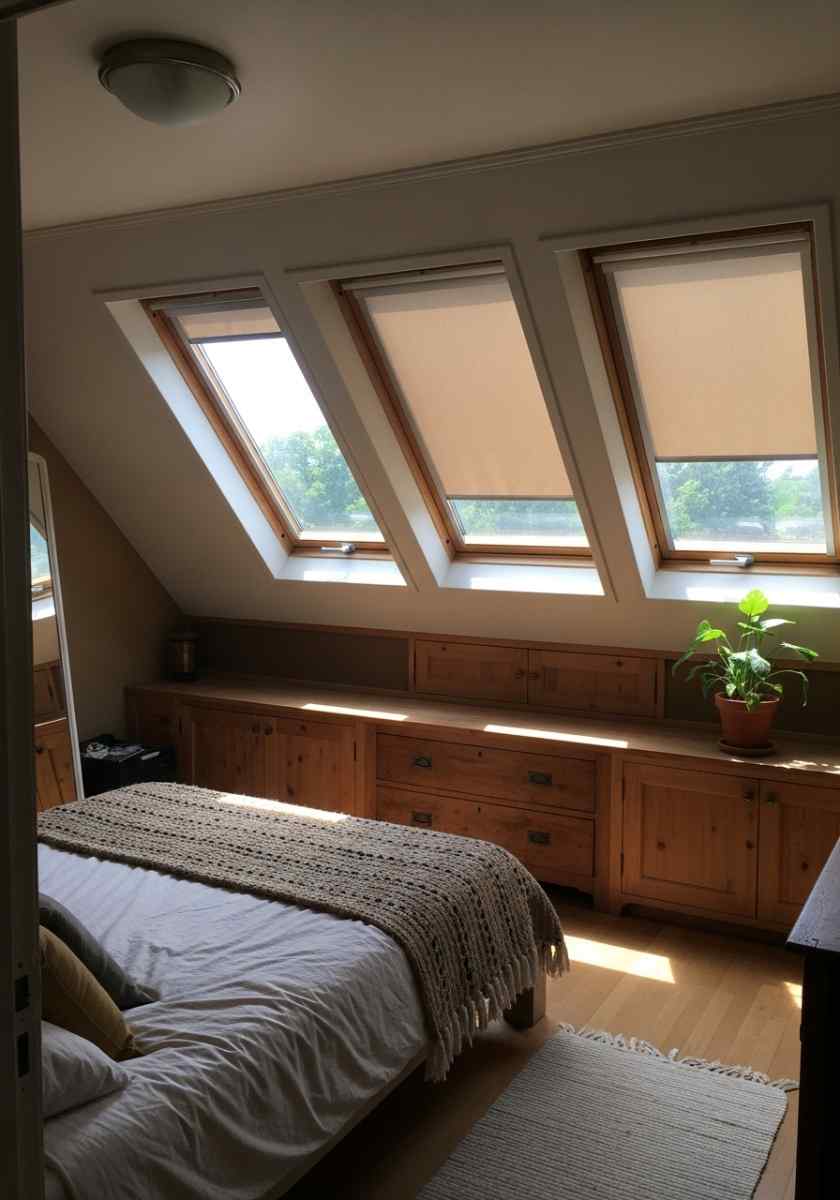 That A-frame window with the triangle shape is a gift. Build a low platform bed that sits under the sill, then layer linen in sand tones. Mount two tiny sconces on the angled walls to frame the view. Place a chunky woven ottoman at the foot for a landing pad. I once did this in a cabin and the room went from awkward to charming overnight.