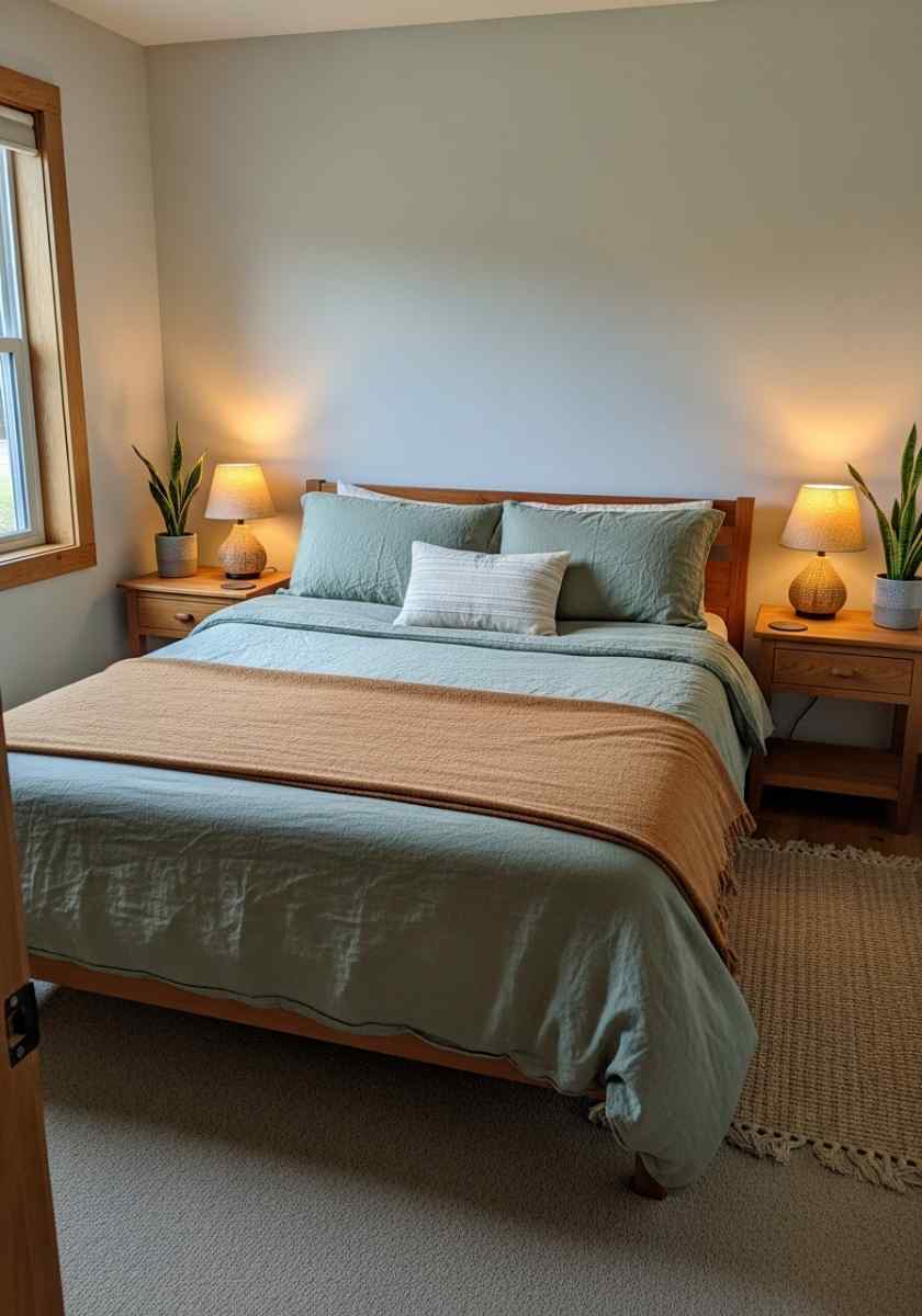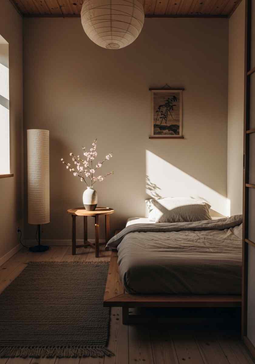 Japandi loves low lines and negative space. Pick a low platform bed (no tall headboard) and a futon-style mattress if your back’s fine with it. Use warm oak or ash, not orange wood; the finish matters. Keep textiles quiet: stone, oatmeal, pale gray.