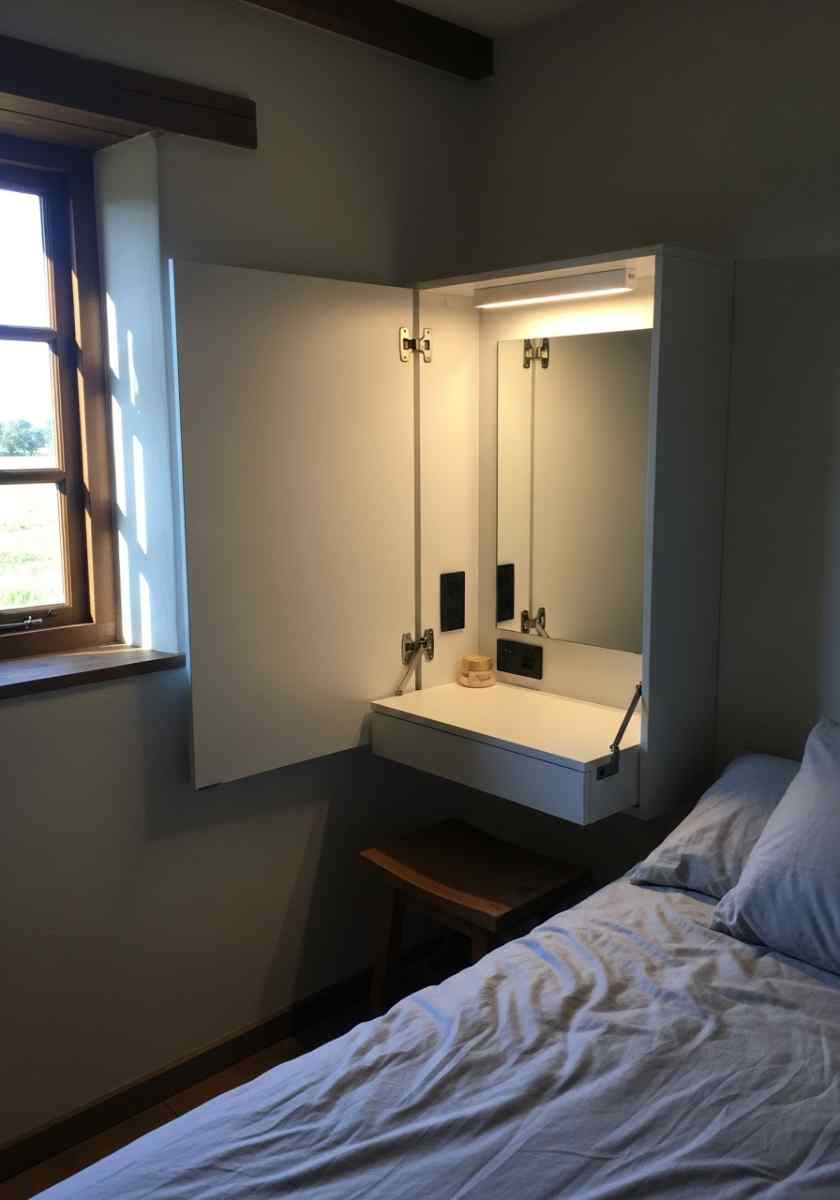 Want a vanity but no space? Build a fold-down wall cabinet with a shallow shelf and a mirror inside the door. Add a small puck light or LED strip at the top and a hidden outlet for a hair tool.