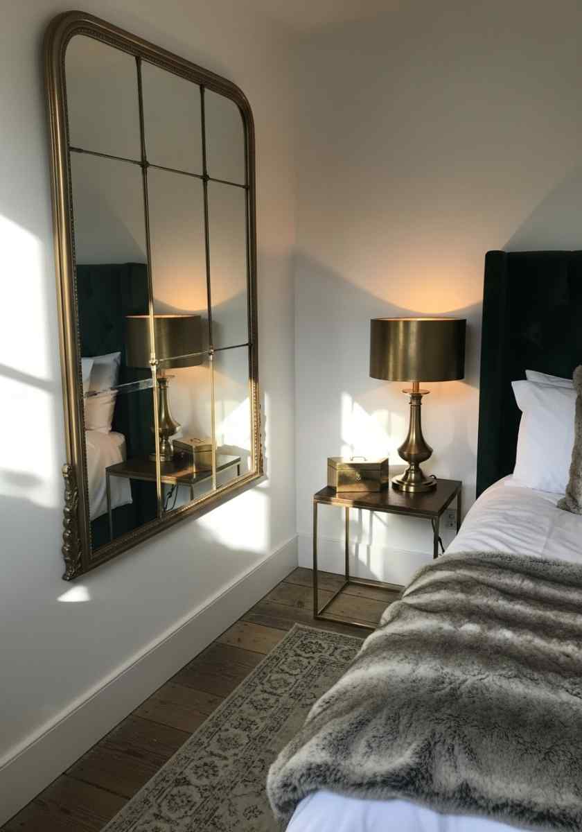 A round brass-framed mirror over the bed bounces light; two slim pendants free up nightstand space. Add a faux-fur throw at the foot (washable works).
