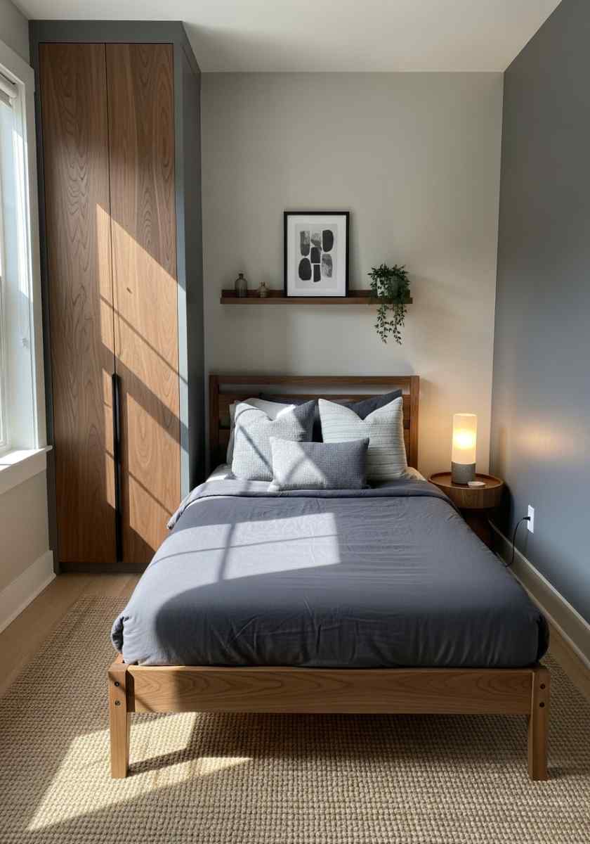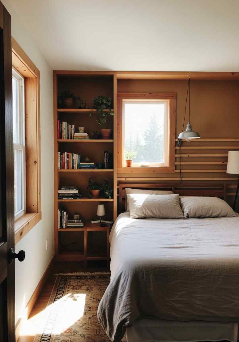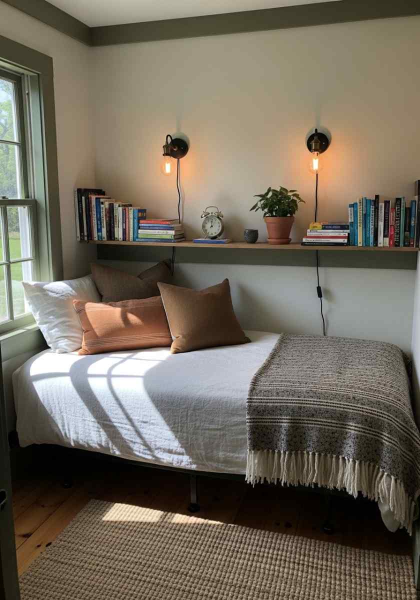 Plant one small fern or a simple branch in a vase; that’s your “decor.” Add a wall shelf that spans the room at 6–7 feet high for books and boxes, leaving air under it. Lighting stays soft—paper lanterns or dimmable sconces.
