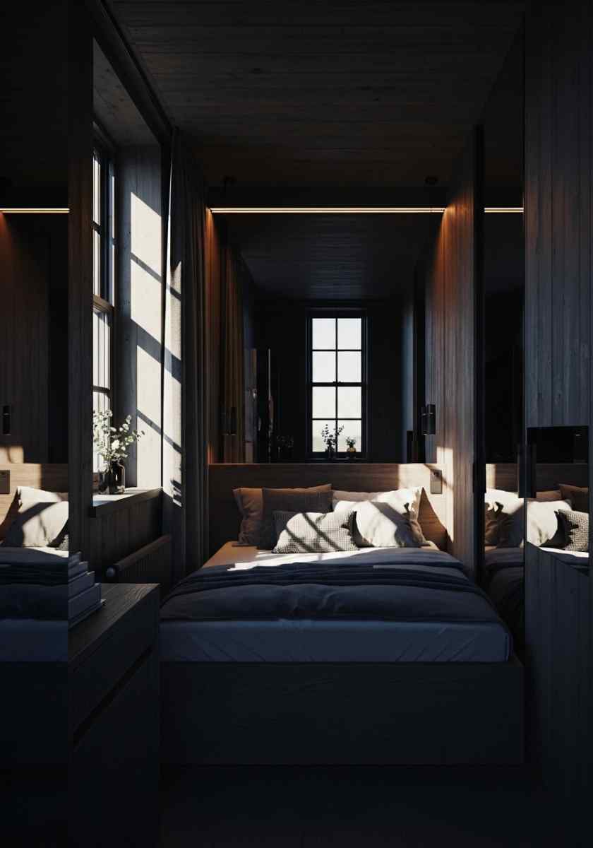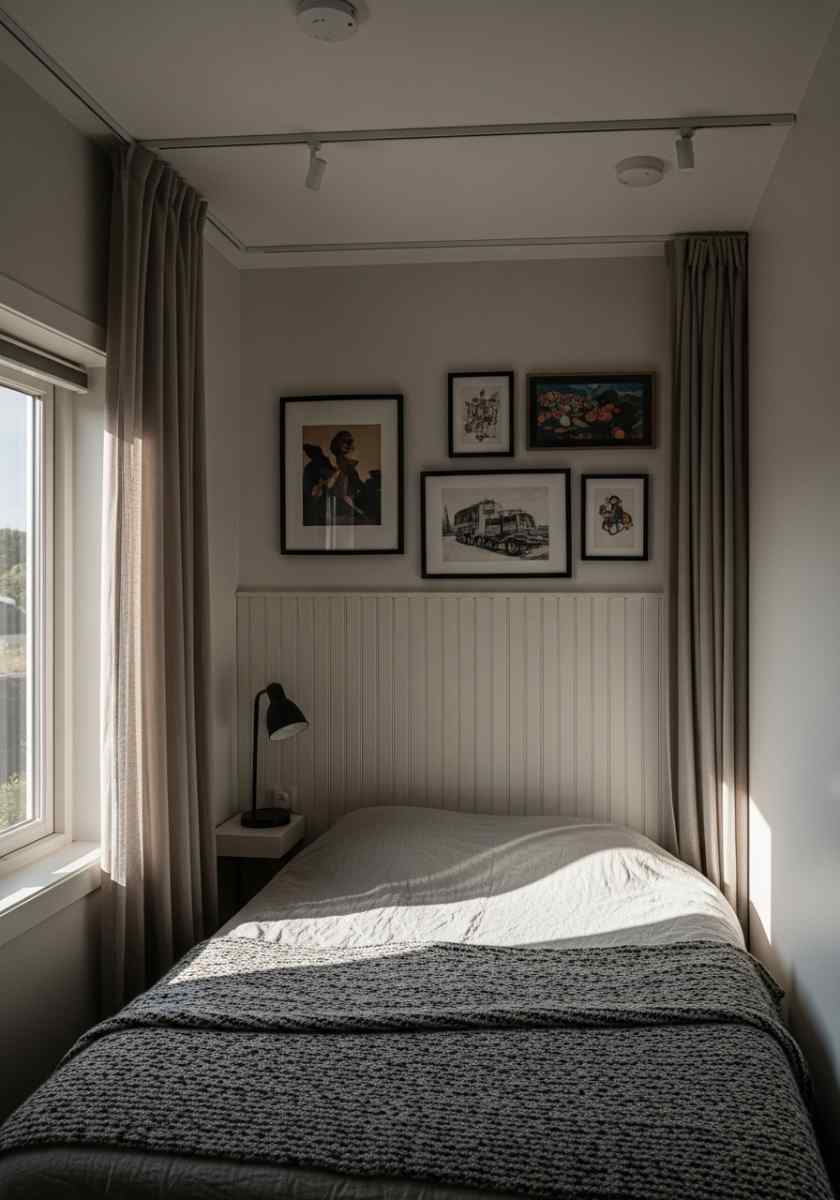 Use black metal frames and a linear sconce for clear lines. A linen blackout shade keeps mornings controlled.