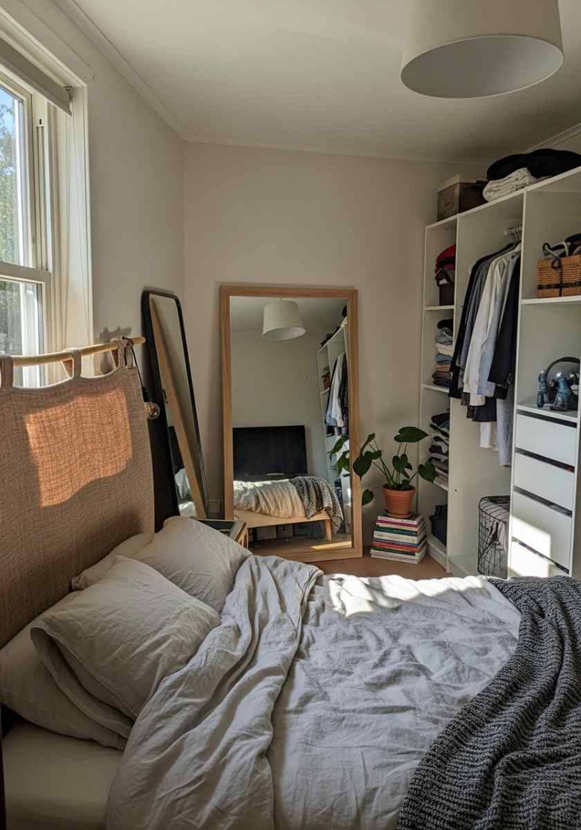 Lean a full-length mirror (rubber pads behind so it doesn’t slip) and tuck a slim storage trunk at the foot of the bed. You can roll back everything later and get your deposit. These are small bedroom solutions that pack a punch without a drill.