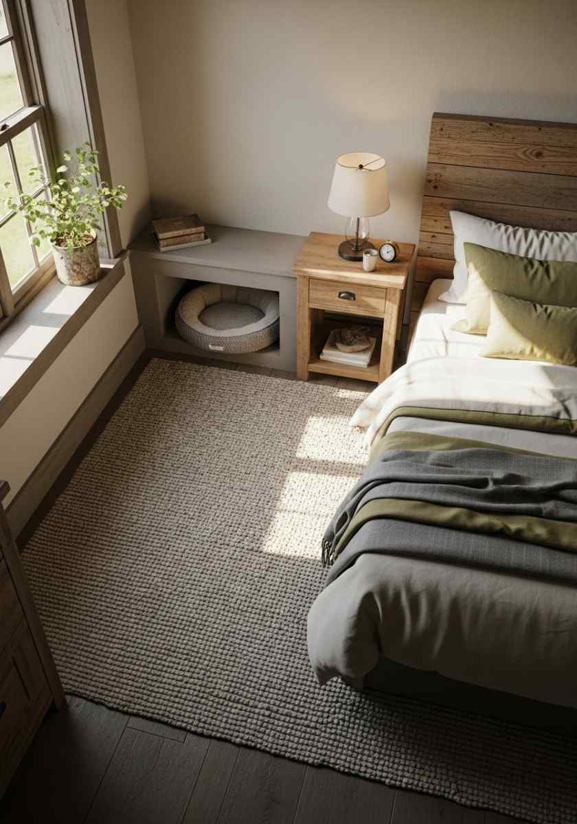 Pets live here too. Pick washable duvet covers and zip-off cushion covers. Tuck a pet bed under a console or at the foot of the bed (a shallow bench with cushion works).