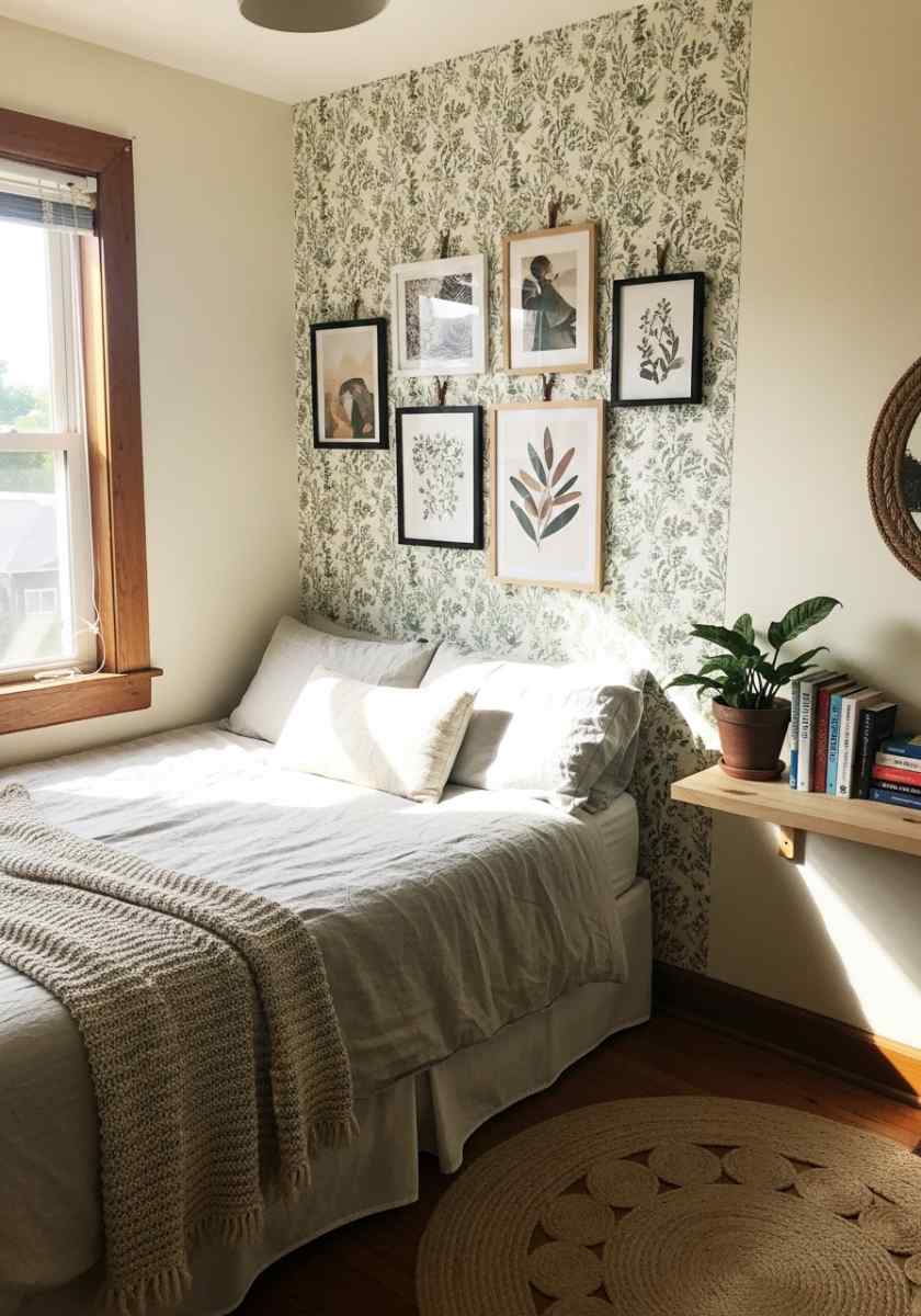 A classic floral wallpaper with soft gray tones adds movement without shouting. Pair it with tailored drapery and a quilted coverlet. Then use a narrow patterned runner across the foot of the bed for color. Pattern scares people in small rooms, but here’s the real trick I use with clients: choose one large repeat pattern instead of lots of tiny ones. Big pattern reads cleaner and calmer.
