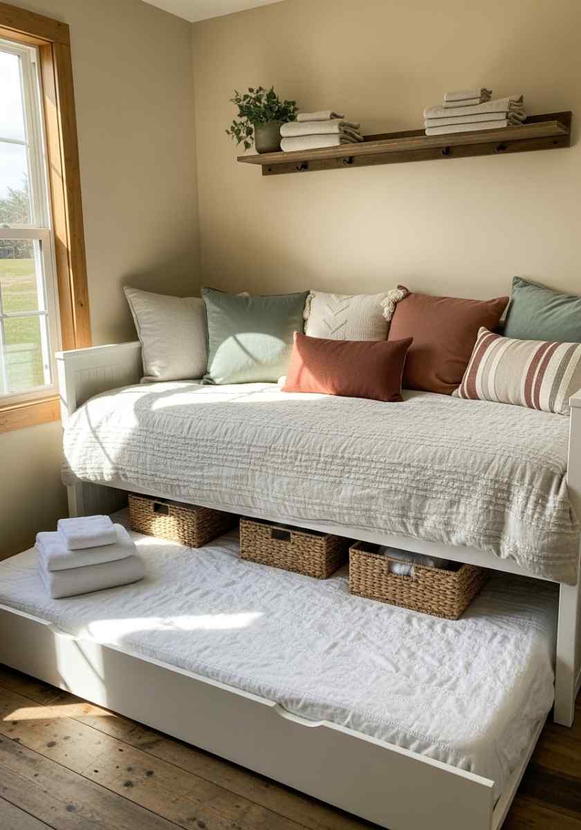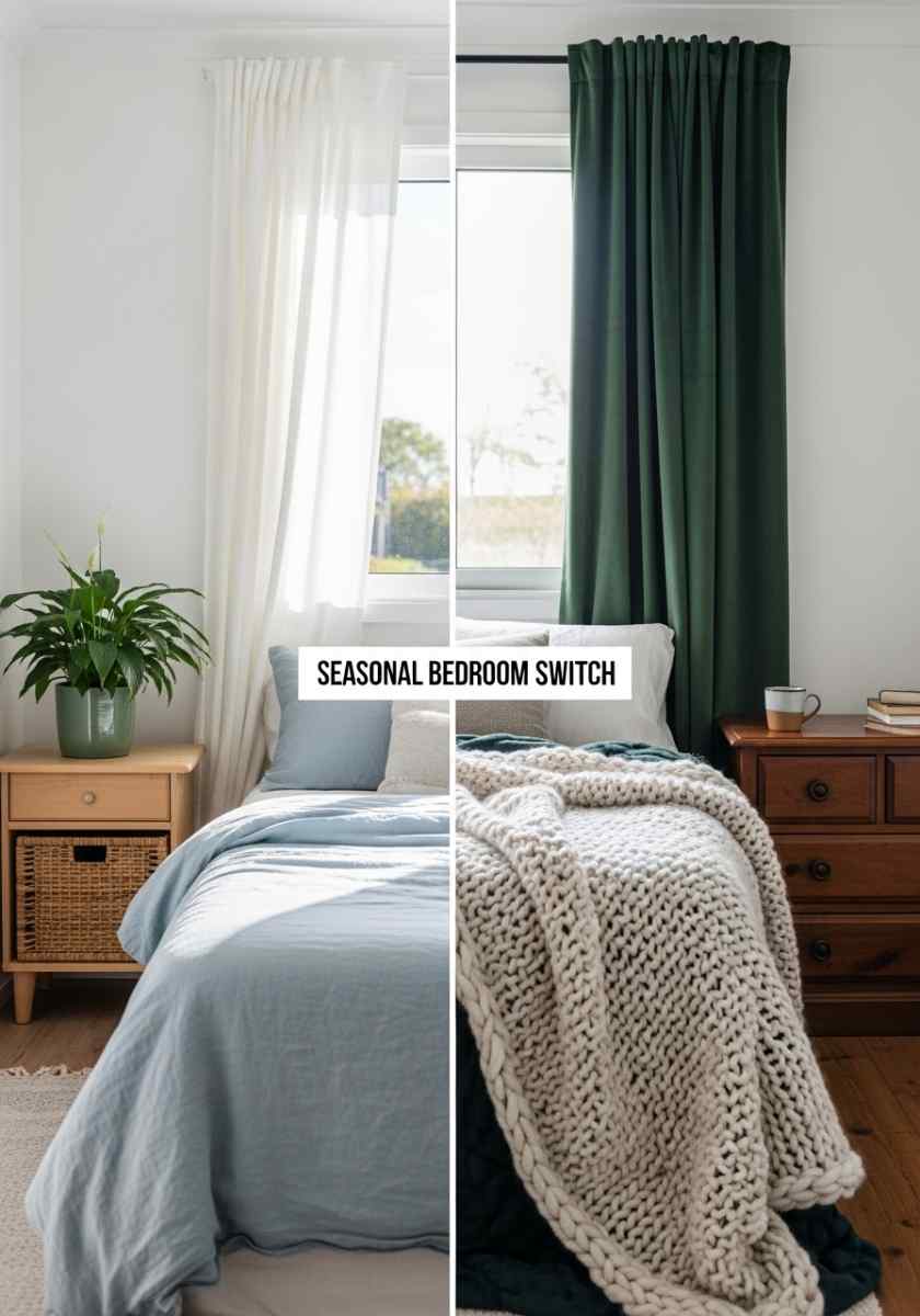 Store the off-season set in vacuum bags under the bed or in a high closet bin. Swap pillow covers and one art print to reset color mood fast.
