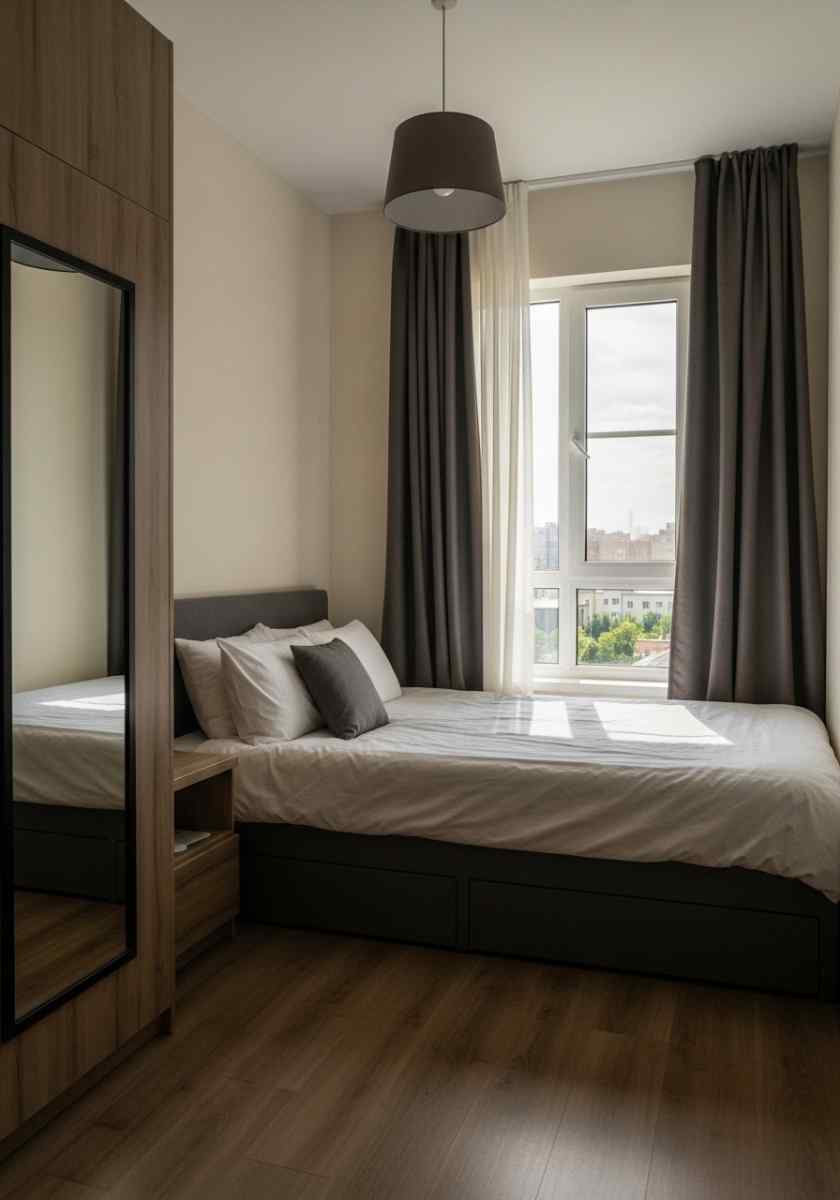 Hang curtains wide and high to lift the room, and use matte black curtain rods so they don’t shout. With a few reflective finishes, you get moody and airy at once—seriously one of my favorite tiny bedroom ideas that looks expensive.
