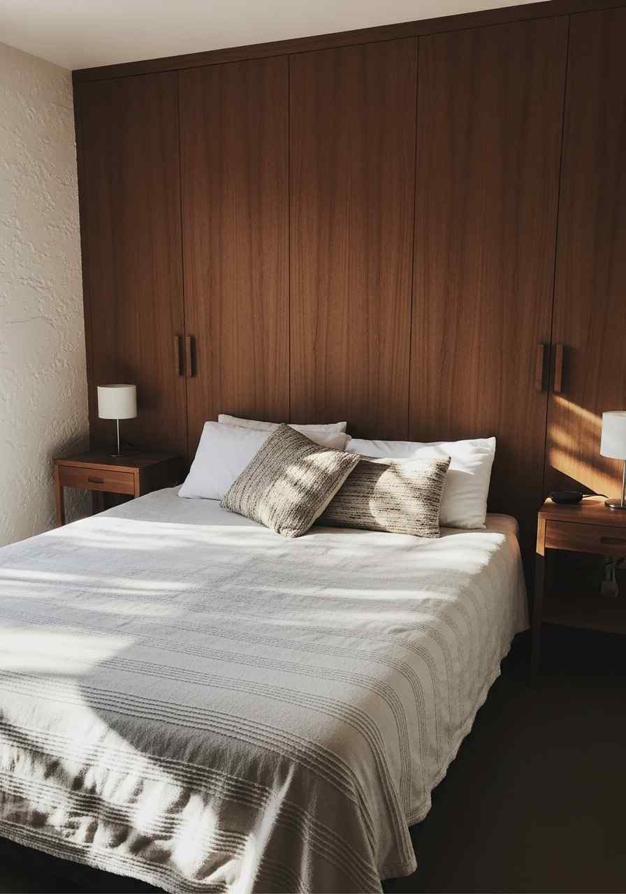 Build a shallow closet with pocket doors; inside, use pull-out baskets up high for seasonal stuff and a short hanging rod for shirts. For a cool-neutral palette, mix warm white walls with gray-beige bedding and one smoky accent pillow. Keep art big and simple (one piece) so your eye rests.