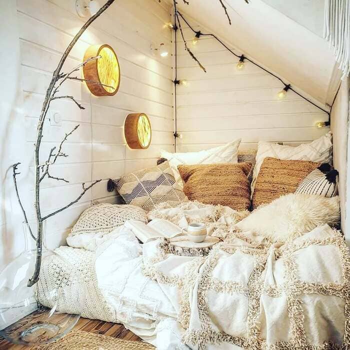 That snug corner wrapped in white wood, string lights, and chunky throw pillows feels like a nap you already took. Low ceilings are not a problem, they are a hug. Keep the mattress low, pile textures, and use two wall sconces so the lights don’t steal floor space. I love the bare branch in the vase, it draws the eye up without shouting.