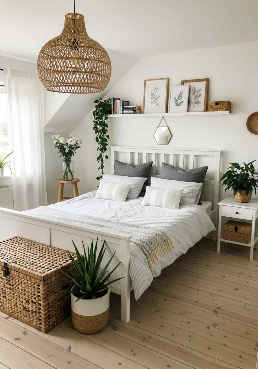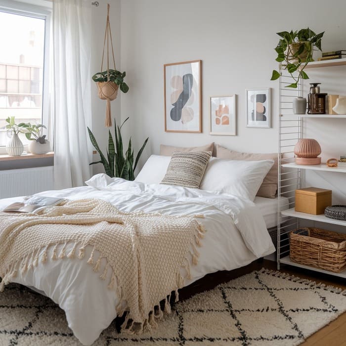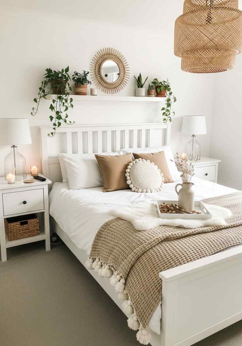 For ladies small bedroom ideas that feel breathable and natural, study this space. Start with a white bed frame and matching side tables. Add tan knit throws, tassel edges, and a round pillow with pom poms. Above the headboard, a skinny shelf displays small plants and a rattan mirror. That shelf is doing double duty as art and headboard extension. A woven pendant light ties the textures together. Keep surfaces mostly clear and use a tray on the bed for tea or jewelry. Little habit I teach clients: store the TV remote and lip balm in the nightstand basket so the top stays uncluttered. This is a woman-friendly small bedroom design that ages well and photographs beautifully.
