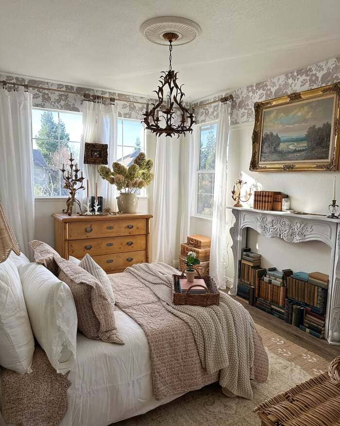 Creamy walls, carved mantel full of books, and an antique dresser that actually stores things instead of stories. Brown, beige, and soft taupe can feel rich when you layer them. Use a tray on the bed for tea and remotes, yes it is allowed. Wallpaper border near the ceiling draws attention up. That tiny move lengthens the walls.