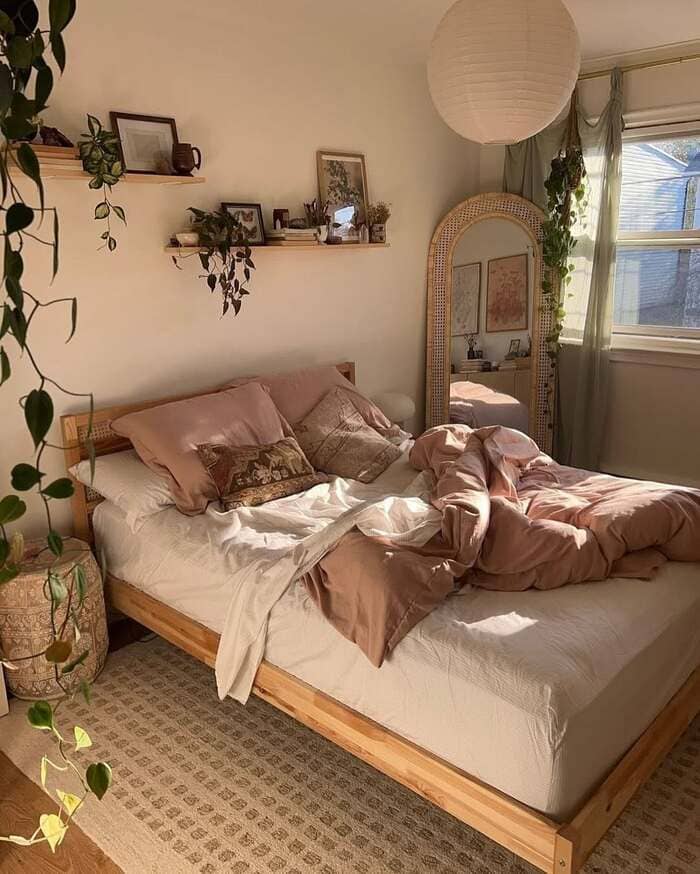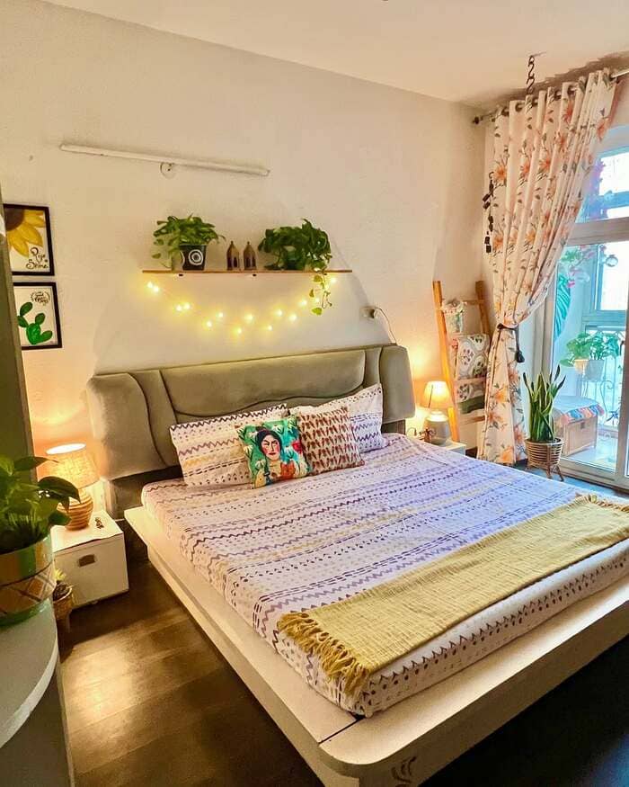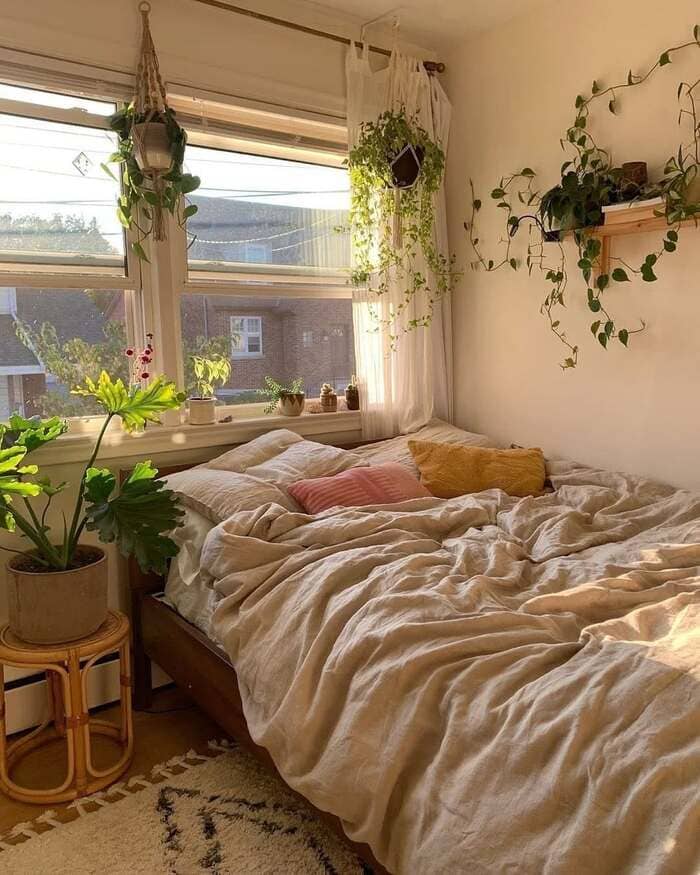 If your bed lives under the window, let plants frame it like curtains. Macramé hangers in the corners, one short shelf off to the side, and warm throw pillows in mustard and coral. Feels like vacation mornings.