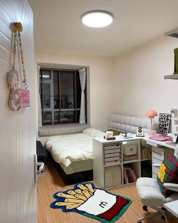 The coziest desk nook with cubbies, a cheerful pillow, and a fries rug that made me laugh way too hard when I saved it. Function can be cute. Use a narrow desk that doubles as a nightstand. Add cube storage under the desktop for notebooks and makeup bags. A swivel chair pulls in and out clean, and a clamp lamp saves surface area.
