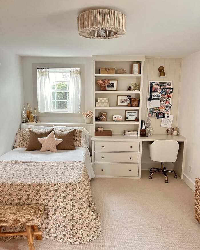 A compact bed tucked beside a built-in desk and bookshelf, neutral bedding with a star pillow that made me smile. Built-ins are cheats for small rooms since they eat clutter. If you can’t build, fake it. Use a narrow drawer unit plus a shelf above to frame the bed. Keep everything one color so it reads like custom work. Pin a mood board near the desk to hold photos and notes.