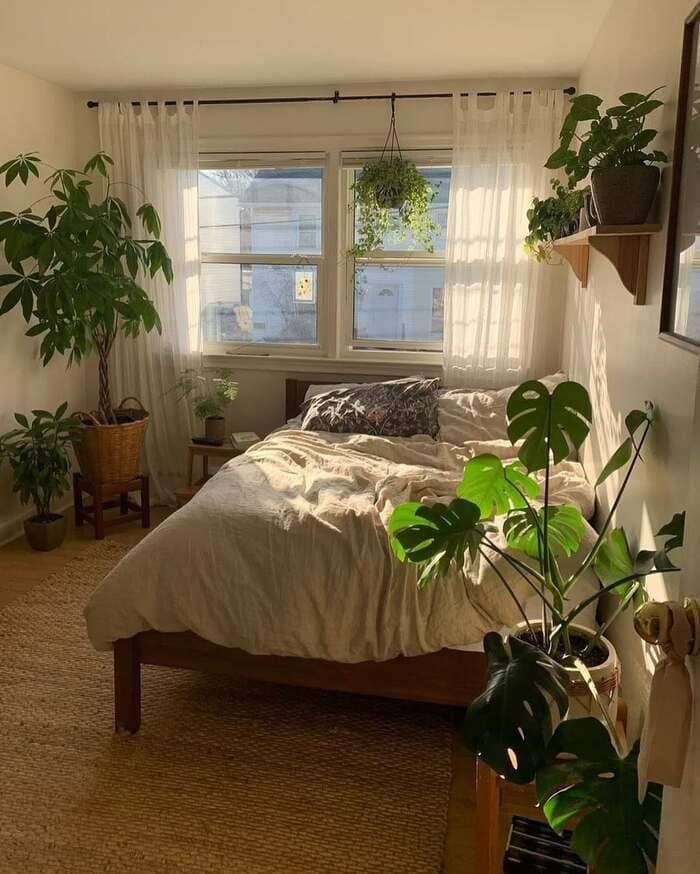 Bright windows, simple white bedding, chunky jute rug. When floor space is tight, go vertical with a hanging planter between windows. The jute rug is the quiet hero. It grounds the bed and hides shed leaves like a champ.