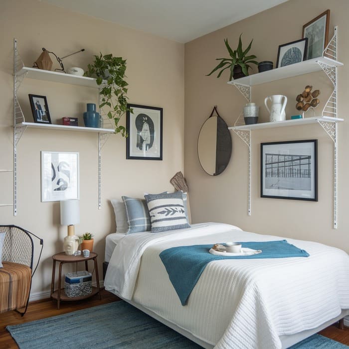 Clean white shelves with graphic art make a tiny room feel smart and grown. Keep the bed light and the throw bold. Group frames by black and white so it looks tidy. A round mirror near the corner bounces light and softens edges.