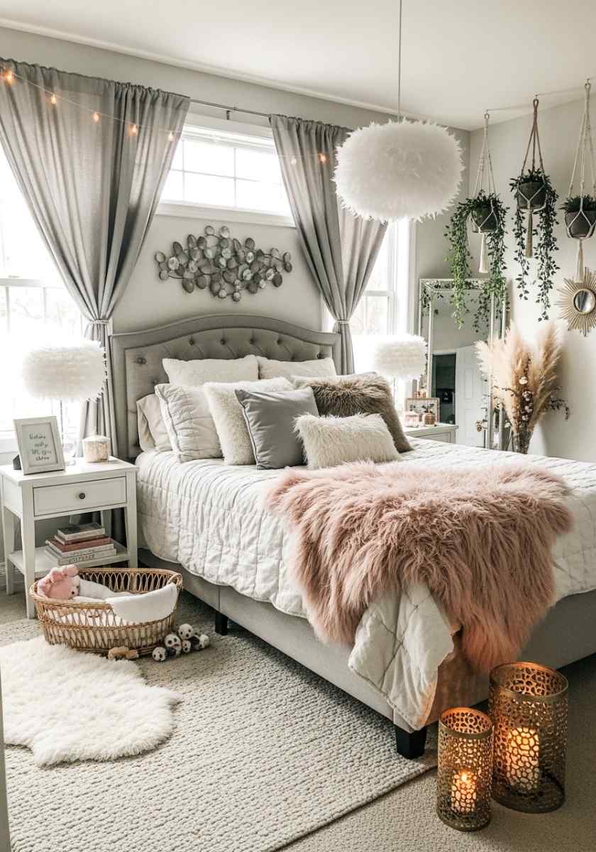 This room nails women’s small bedroom ideas that feel serene. Start with a soft gray bed and drapery to keep the bones neutral. Layer white bedding with a few different textures, like channel-quilted shams and a fuzzy lumbar. The blush faux-fur throw brings warmth without screaming pink. Hanging plants frame the mirror and pull the eye up, which makes a short room feel taller. Feather pendant lamps add whimsy. I know, they can feel extra, but they glow like a little moon at night. Use baskets for baby stuff or blankets under the nightstand. Pro tip from a tired designer: keep the rug light and high-pile so it catches morning light and instantly feels fresh. This is one of my favorite small bedroom ideas for women who crave calm with a teeny bit of glam.