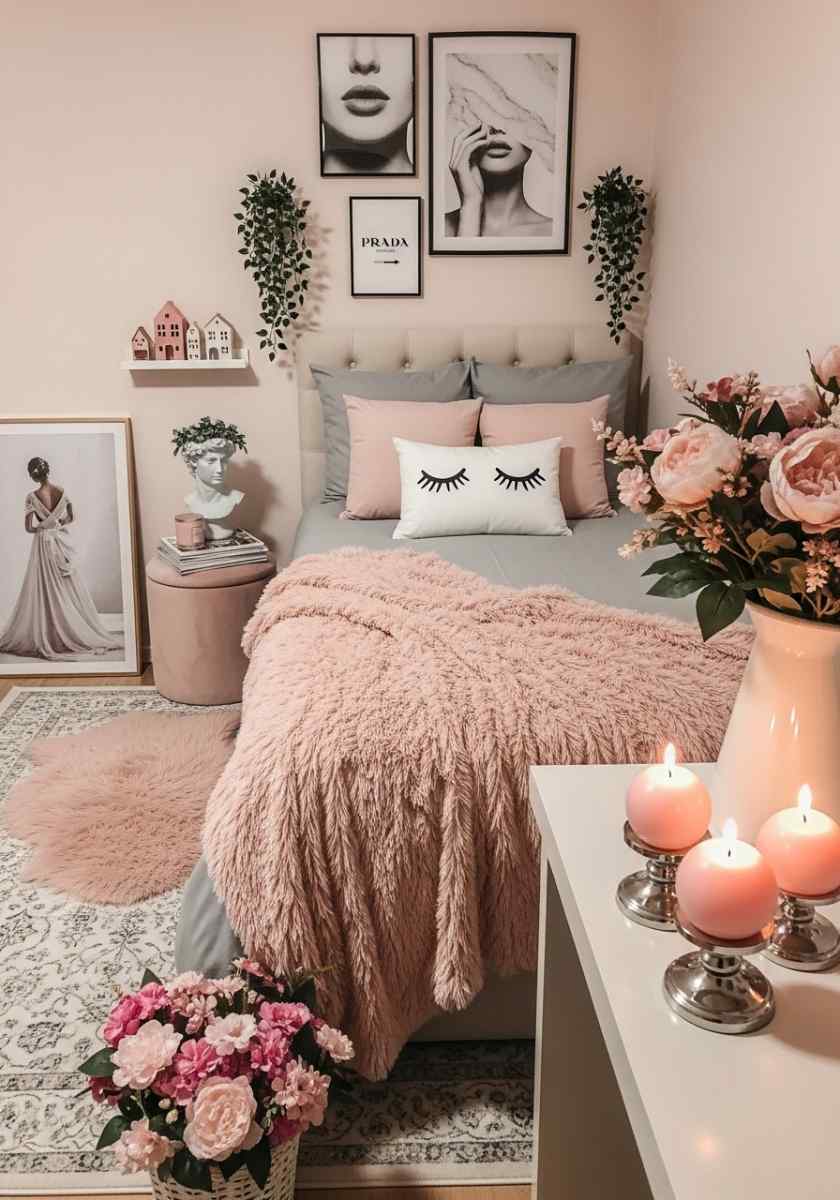 If you want small bedrooms for women that read polished, try this chic setup. Pale pink walls, gray duvet, and a waterfall of blush pillows give it a soft base. Style the nightstand with a mini bust statue, a stack of books, and a sleek candle. Above the bed, black-and-white fashion prints keep it modern so the pink doesn’t go sugary. I’m picky about throws, but a long-haired blush blanket instantly adds volume. Tuck a small shag rug on the floor to warm bare toes. Add faux peonies or roses in a white vase for a shot of life. Little hack: use matching frames in different sizes to keep your gallery wall tidy. This is women’s small bedroom ideas 101. It says grown, not dorm.