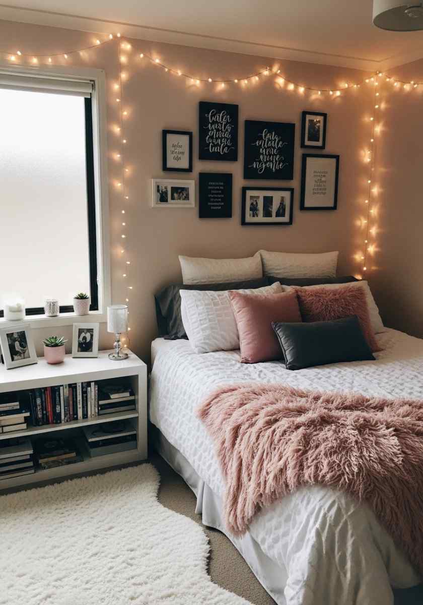 This one proves feminine small bedroom ideas can still be cozy and smart. The glow of string lights outlines the gallery wall so it turns into a big statement without spending much. Keep the bedding simple, then stack a trio of accent pillows in blush and charcoal. Slide a low bookcase by the window to create a mini reading perch. Group a couple succulents, framed photos, and a glass lamp for layered interest at eye level. Notice the fluffy white rug and small pink throw? That texture mix is everything. It’s a tiny upgrade, but swap bulky nightstands for slimmer tables with open shelves. You’ll get storage and breathing room. I’ve repeated this exact setup in client apartments more than once because it works.
