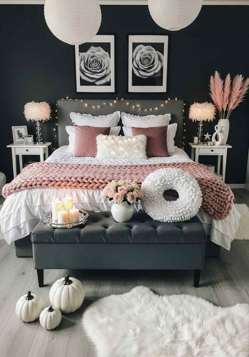 Bold wall color in a small room scares people, but it shouldn’t. Dark paint can make small bedroom ideas for women feel luxe. Here, deep charcoal walls set a dramatic backdrop. Layer the bed with crisp white sheets, a chunky blush knit blanket, and rose throw pillows. A tufted bench at the foot gives you a landing spot for trays or folded sweaters. On both sides, white nightstands and lamps balance the dark wall. I love the paper lanterns and fairy lights for soft sparkle. Bring in pampas grass and sculptural vases to keep the palette warm. The trick is contrast: dark walls, light linens, rosy accents, a touch of metallic. It’s moody but still friendly.